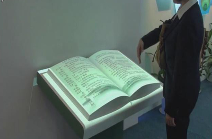 電子翻書:主要是由電子設(shè)備和投影技術(shù)組成,它不同于空中翻書是飄在空中的,是有實(shí)體的書模型,上面是投影機(jī)投射下的內(nèi)容,人在做出翻書動作的同時(shí)也會發(fā)生脆脆的聲響,就像正在看普通書籍樣。