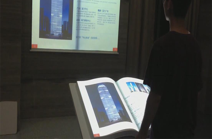 虛擬翻書系統(tǒng)也就是虛擬電子書,其原理就是將投影畫面投射在書本模型上,當(dāng)參觀者做出翻書手勢后,紅外感應(yīng)器會獲取參觀者的動作,并且將動作上傳給計(jì)算機(jī)進(jìn)行處理,然后后臺程序會根據(jù)指示來實(shí)現(xiàn)翻書的動作。